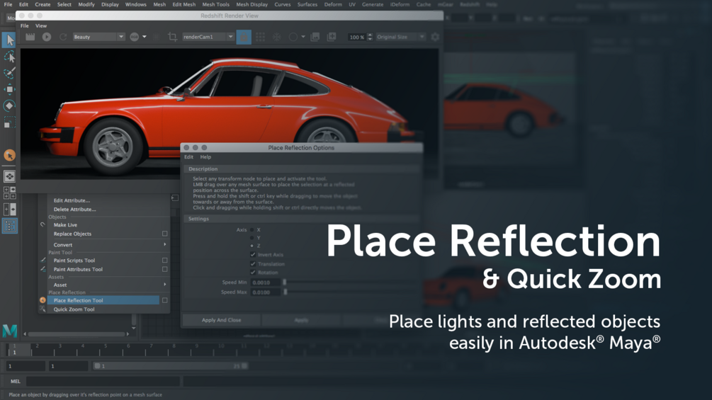 When properly installed the Maya Modify menu has new menu items named Place Reflection Tool and Quick Zoom Tool. It also allows to open a standard option box to set the preferences for the place reflection tool.