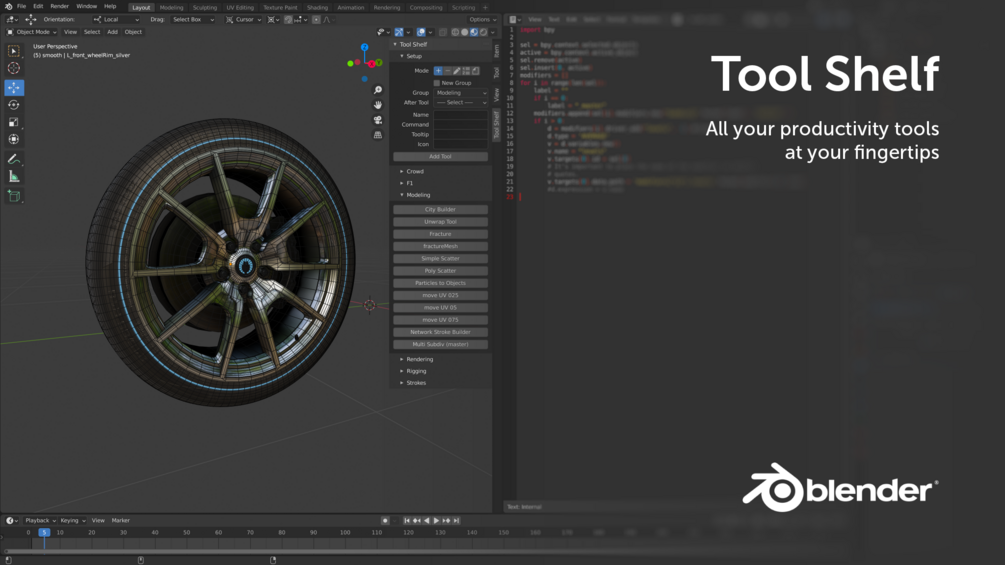 Tool Shelf is a small productivity add-on for Blender to collect all commonly used tools and scripts in one easy to access panel. This is most helpful for users coming from other DCC packages where such tool spaces are part of the workflow.